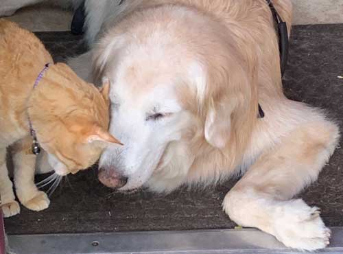Cooper, was adopted from RAG 16 years ago and he crossed the Rainbow Bridge on 10/25. His story was recently published by RAG and he will be greatly missed. I have loved all my dogs but this boy was absolutely special, he loved everyone and everything and was always by my side. The house seems too empty and his noises are all missing. However, I had to let him go before his neurological issues worsened. I am so blessed to have had this friend for 16 years and beyond. I am heartbroken. For months I helped him get in and out of the car to go play on the grass and see people. A true Golden he adored food to the end and had his first marrow bone ever before we said goodbye. This rescued angel had been hurt before I got him and I will never know if that is why he was so kind and happy to live with us but I do suspect it was so. He had a best friend, Basil the cat, who is in mourning for him and who is now always on my chest to feel my heartbeat. The photos I have chosen to share are from the morning before he moved on. Basil is saying goodbye. I am hugging him and back in February. RIP Cooper, we adore you.