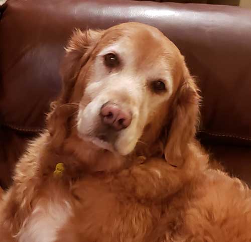 Dr Jake relaxingOne day, Jake decided he didn’t want to go to meet and greets anymore, and he acted a bit testy to other dogs. Many Goldens came to our house to visit or be fostered; Jake was the perfect host. He met his guests at the door and escorted them to the backyard. We adopted Crystal and the two became very bonded. Crystal was the love of his life. They played all the time. When she went to the Bridge, he was depressed for a long time. He earned the title of Doctor because he alerted us to Crystal’s ear infection, and later spleen cancer. He also succumbed to Hemangiosarcoma in his spleen.
