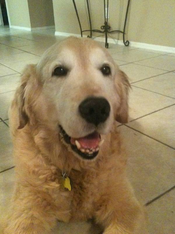 George Bailey came into our lives in October, a week before Halloween. On the day he arrived, we swore to make the remaining years of his life the best they have ever been. George was 10 years old when he made the journey to the rainbow bridge – way too young to leave our lives. George Bailey had a way of touching every heart he met. He would lean into you for an ear scratch, or put his head in your lap for a few pats on the head. He would sit quietly if he knew he was going to get a treat, or hold up his paw to meet you if you were new to him. He would let you cry on his shoulder, or make you laugh with his goofy grin. To look at George Bailey was to see a mixture of a golden retriever and a large teddy bear. He could be found every Friday at the PetSmart Corporate office, laying spread eagle in the middle of the isle, hoping someone would notice him and stop to say hello. It was hard not to notice him lying there, and so many, many folks would stop by to see him during their day. He loved to go for car rides and would often ride shotgun, giving you an “awe, mom!” look if you told him to get in the back seat. It didn’t matter where he went, just as long as he was included. He was trying to nab the world record for destroying squeaky toys the fastest. We would often go to PetSmart and he would put his head in the toy bin and nudge the toys around until he found the perfect toy and then he would carry it to the counter for check out. This would always draw a comment or smile from the associates and customers alike. George Bailey was a great promoter of charitable organizations. He participated three times in the Phoenix Alzheimer’s Walk; twice in the PetSmart Charities Pet Walk in Tempe; and once in the Scottsdale Prada Del Sol Parade. He even modeled and was selected for the PetSmart Charities 2013 Calendar. In addition, George Bailey loved to participate in the Rescue a Golden, Barnes & Noble Gift Wrap event. He loved the fact that he could get so much attention in one location. There are so many stories; so many smiles; so many tale wags; so many memories. George Bailey touched so many people. He truly made our lives wonderful. … did you hear that bell ringing? An angel just got his wings….